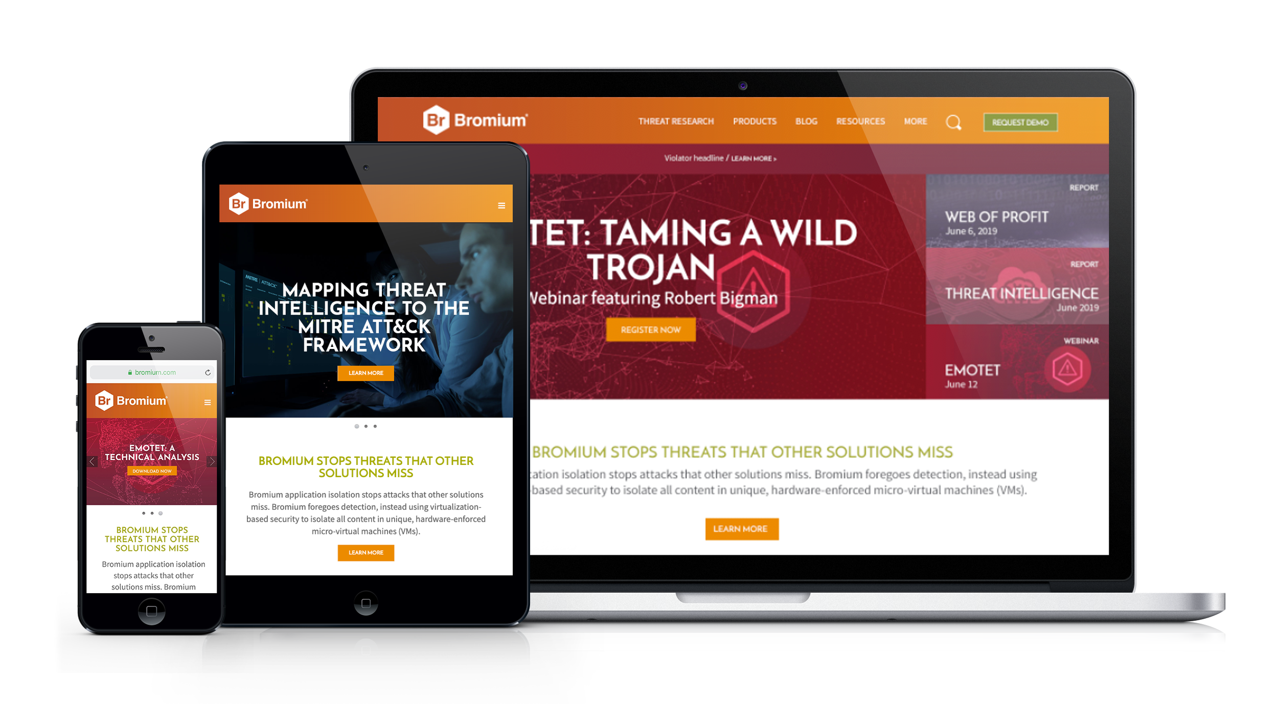 Technology is a tough arena to be in to make yourself visual stand out and still tell the companies story. Our client at Bromium was willing to take a chance and allow for something different so that they would stand out in the busy security field. Ultimately chosen was a very colorful, very adaptive design that allowed the Bromium team to choose their color path and have a bit of personality in their visuals. The custom icons inside the circles are a key part of telling the story and of the brand.
