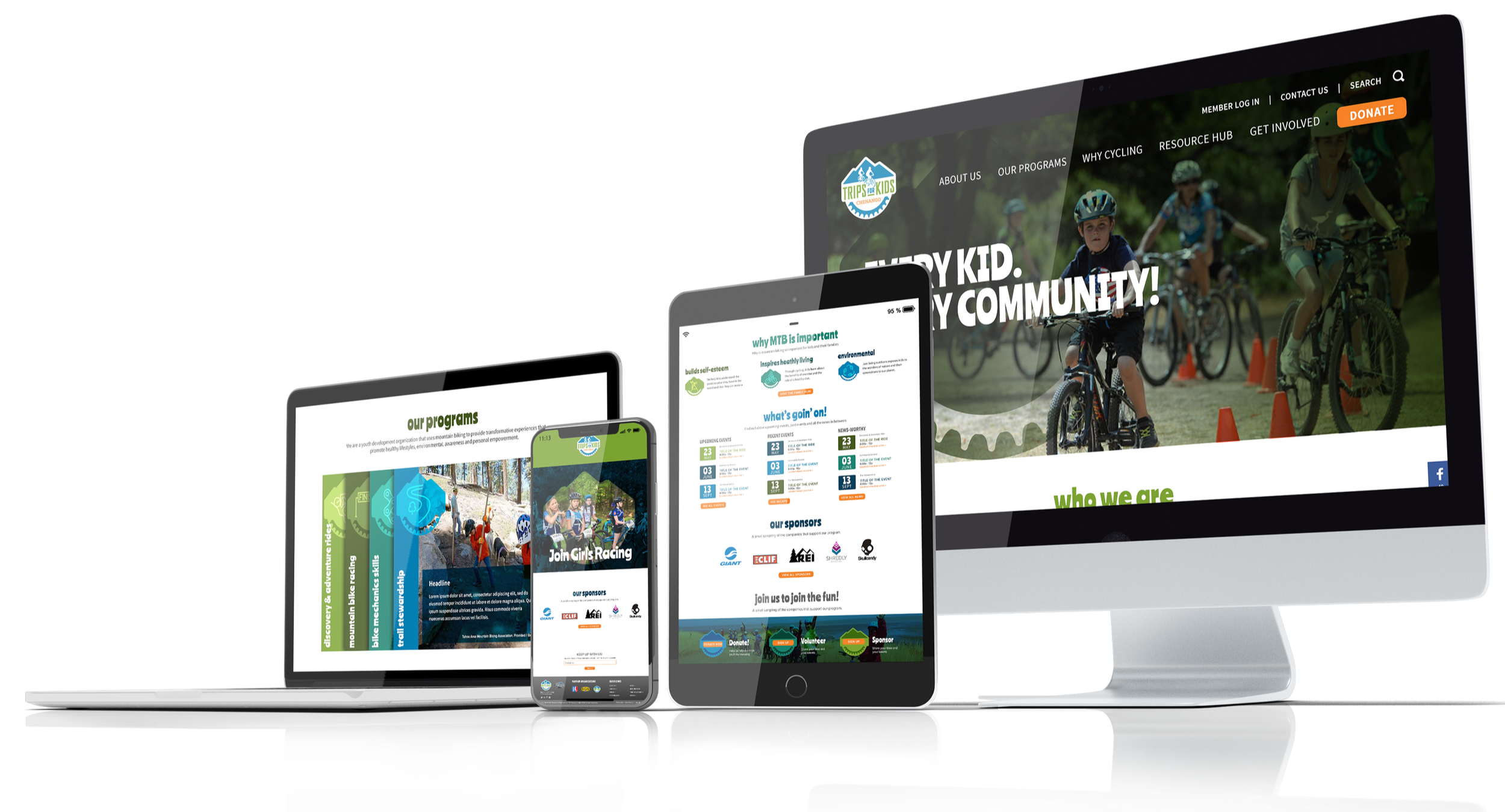 Trips for Kids in New York reached out to us having seen our work for IMBA. One of my favorite ways to receive new clients is through a great referral. While the love of the IMBA site was strong, I suggested a slightly different direction due to the audience for T4K. We highlighted the colors of the logo, added a few new ones, chose a font that would work fo both kids and parents, and with that, we have a new brand for a great non-profit and a very worthy cause! KIDS ON BIKES!!